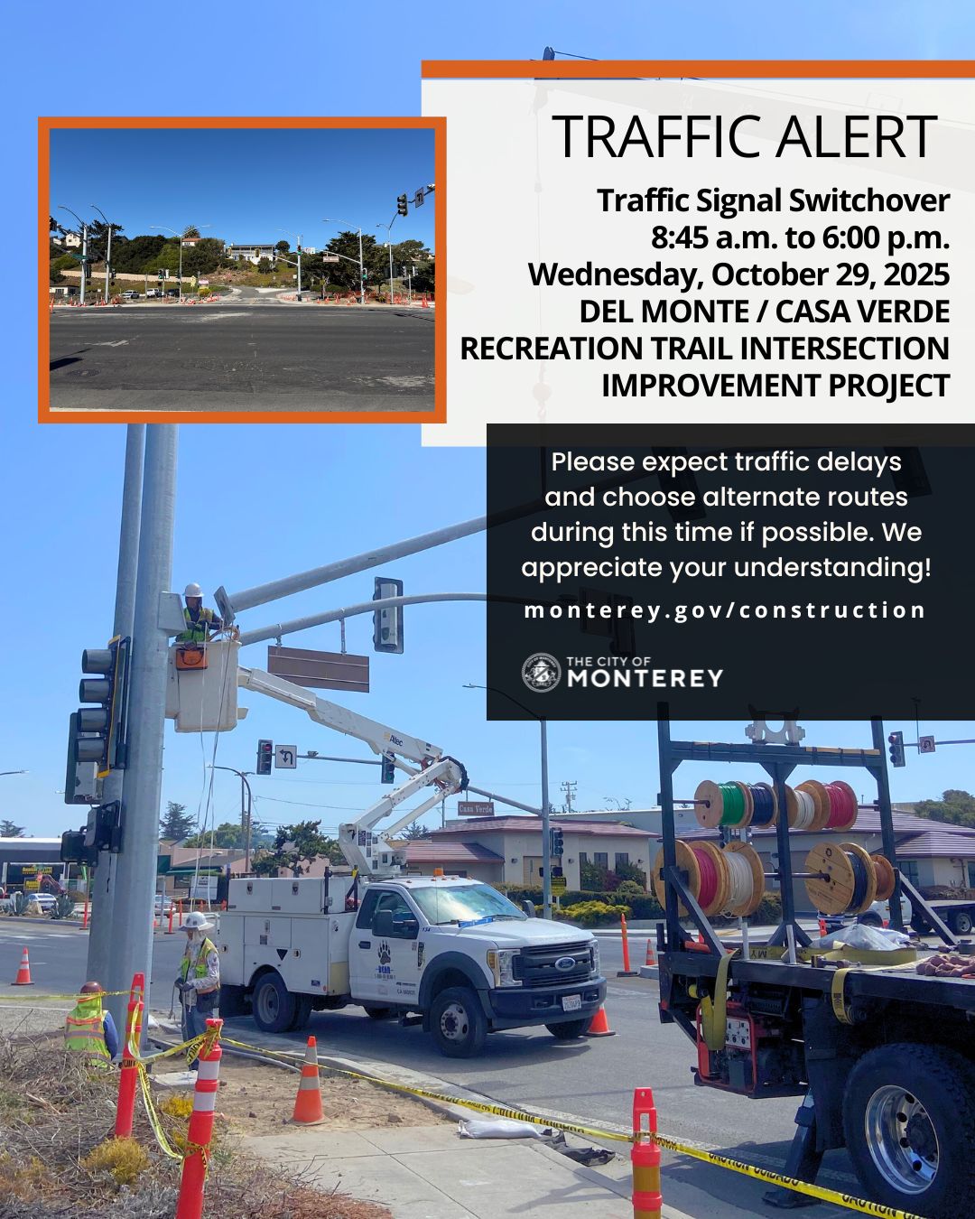 Construction on the Del Monte/Casa Verde Project has started as of February 2025. The project is currently anticipated to end late summer 2025. For weekly updates of construction progress and impacts to traffic please visit the the City of Monterey Construction News website (monterey.gov/construction) or sign up for the Construction News email list.